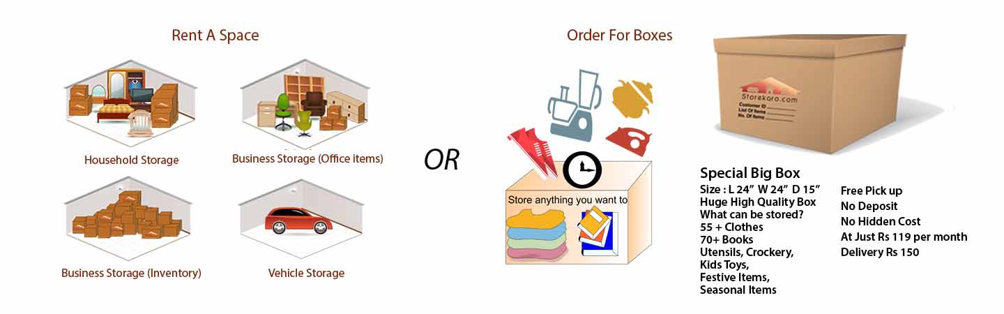 | Box | 24" x 24" x 24" | 4 sq.ft | A good size to store seasonal items, gym equipments, Clothes, books, camera, utensils, frames, kid’s toys, office stationeries, files etc. You can store as much item as it can fit in the box. |